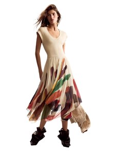 Ta elegantna maksi obleka Desigual je izdelana iz 97 % bombaža in 3 % elastana, kar zagotavlja udobje in prilagodljivost. Obleka ima čolnasti izrez in je brez rokavov, idealna za pomlad in poletje. Cvetlični vzorec daje obleki edinstven videz.