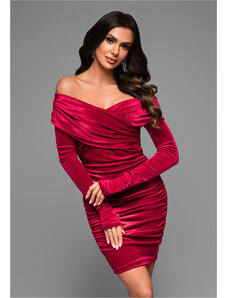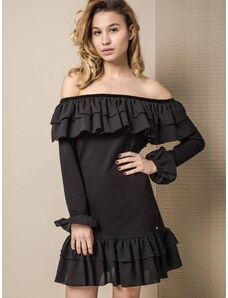 Dress of the Polish La Diva collection made of chic and elegant material, and at the same time slightly elastic. The model has a fitted form slightly widening downwards, which is finished with a double valance. It has an impressive neckline that beautifully reveals the shoulders. Neckline decorated with decorative frill. The model has long sleeves.