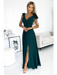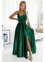 Elegantna maksi dolga obleka iz satena z razporkom na nogah. Lepo oblikovan dekolte in razporek na krilu ustvarjata nenavadno kompozicijo. Izdelana je iz svetlečega, gladkega in rahlo raztegljivega satena. Obleka je idealna za poroko, silvestrovanje, maturantski ples, karneval in druge večje priložnosti.