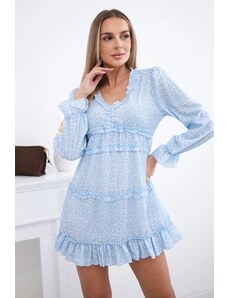 Ta svetlo modra mini obleka je narejena iz lahkega materiala, ki zagotavlja udobje in stil. Ima dolge rokave in ohlapen kroj, ki je kot nalašč za vsakodnevno nošenje ali posebne priložnosti. Obleka je zasnovana s pozornostjo do detajlov, kot so nabrani rokavi in elastičen pas, ki poudari postavo.