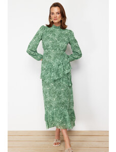 Trendyol Khaki Floral Skirt Frilly Lined Woven Chiffon Dress