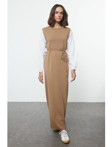 Trendyol Beige Sleeves Woven Piece Detailed Waist Tied Knitwear Dress