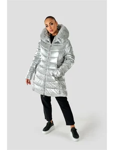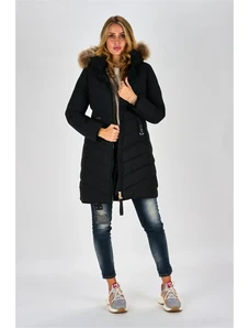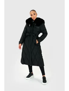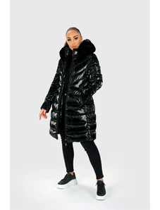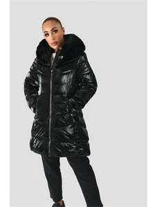 Just-R SREDNJE DOLG SVETLEČ PLAŠČ Z UMETNIM KRZNOM - Črna, S